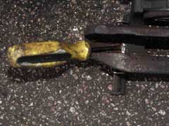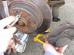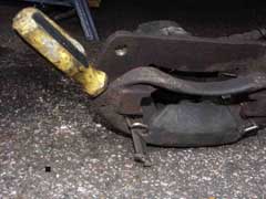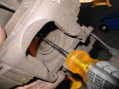 Again a lack of pictures (sorry, hands full) doesn't help. The basics are easy. The reality is a little different. Firstly you'll need to wind the caliper piston back in to fit new pads (this is only for rear calipers as they contain the handbrake attachment, Front calipers normally push back in), as you'll never get them back on the disc if you don't. You'll see the piston has a gap cut into it (like a screwhead). This needs to be turned anti-clockwise to retracted the piston. This is very stiff at first, but easys off. I used the stem of a screwdriver to turn the caliper piston (see pic above left).