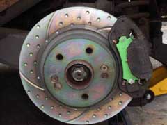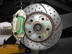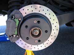 With most Esprit braking systems not living up to the performance of the car, looking after you brakes is a must. When my rear pads needed changing, I decided to upgrade the pads and also the discs to help improve the braking performance. I chose some EBC GreenStuff pads and got some original Lotus rear discs (currently on Lotus discs available for the rears) drilled (supplied by Ramspott & Brandt). There are other options depending on how much money you wish to spend, including new calipers with bigger discs.