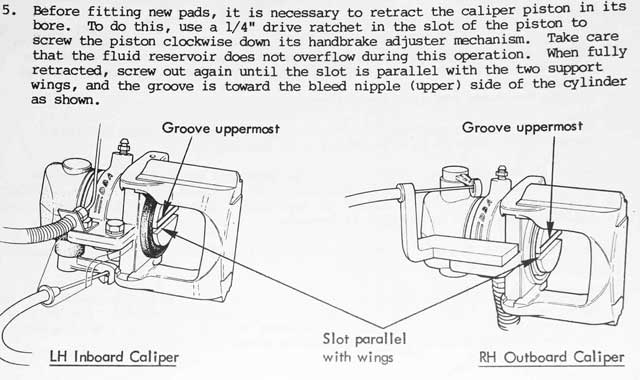 I've since been having problems trying to adjust the handbrake. I don't know whether it matters, but having read up the service manual I've just noticed that the piston should be turned clockwise to wind it back, but then turned anticlockwise just half a turn until the notch is upper most.