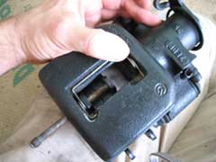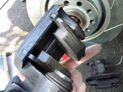 The pads sit in the caliper fairly loosely, feed the pin back through the anti-rattle pin and through the pads. You can copper slip the back of the pads, which is said to help reduce squeaking and stop binding. We forgot to do ours!