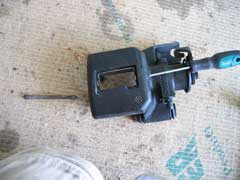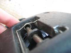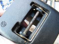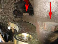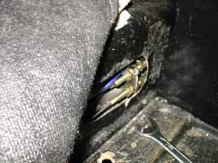 You can now attached the handbrake cable to the caliper, pushing it up through the hole and then hooking the wire over the arm. You can see the handbrake cable on both sides in the two pics above. Check the operation of the handbrake. Ours was now too tight and the pads where holding the disc solid. Adjust the handbrake cable by using the adjusters situated in the inner sill of the drivers side. We removed our seat for better access.