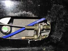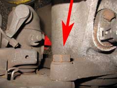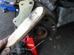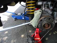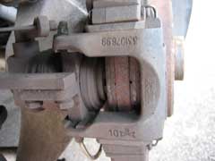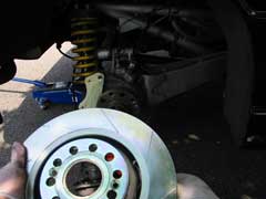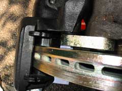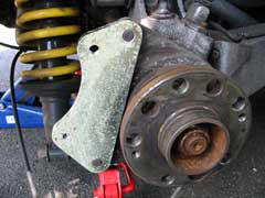 Solid verses vented is no competition, almost twice the disc! We now need to add the caliper bracket to the old mounting holes. The bracket goes with the counterbored hole at the top facing in, as you can see from the middle picture above, which was taken from above. Screw the 19mm bolts back in and tighten to 48 lbs ft.