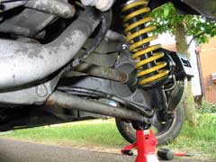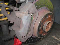 Jack the Esprit up, supporting with axle stands. Take the wheels off and take time to take one last look at the old brakes. Ours are in pretty good nick, as we only changed and discs and pads a while ago.