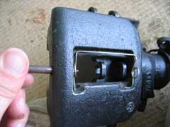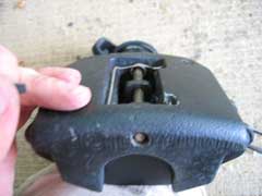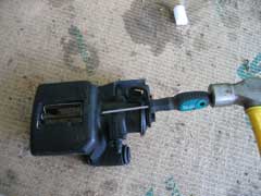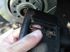 Now to the calipers. Remove the retaining pin than runs through the caliper. We used a screwdriver and gave it a tap with a hammer, which released the pin. Make sure the piston is wound all the way in. Do do this turn it anti-clockwise while pushing in.