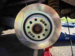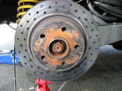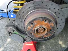 We also had drilled discs, which look pretty good. But not as good as what's about to be fitted. We jacked the whole car up and removed all four wheels, as the system will need bleeding, which you'll need access to the front calipers.