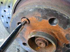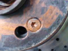 Time to remove the old solid disc to make way for a bigger vented version. You should have two retaining screws holding the disc on. Ours where star shaped heads. You may again find these stiff and they may take some effort to remove.