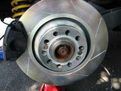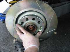 With the bracket in place you can clean up the hub ready for the disc. We used a wire brush to make sure the surface is clean. Ours were in good condition, as we'd already changed the discs a while ago. Yours may take a little more work! Now time to get that gleaming new disc on.