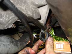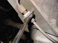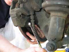 Undo the hose attached to the caliper, then the other end attached to the car. Be careful with the brake fluid as you don't want to get it on your paint work. The hoses have different sized nuts so you can attach the hoses. 11mm, 13mm and 17mm are the three we used. Be careful as if yours haven't been moved before, then they could be very stiff and the pipes can easily snap if too much pressure is placed on them. We found it best to attach the hose to the caliper first and then attach to the car. Make sure all the connection are tight.