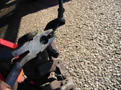 If you've remembered to take off the handbrake, the calipers should slide off the discs. You may need to give them some help. We use a rubber mallet to help ours come off! Once the calipers off you can remove the handbrake cable from the caliper. A pair of pliers should easily remove the cable by unhooking the end.