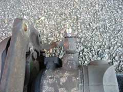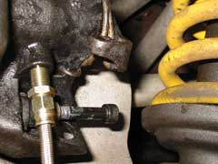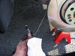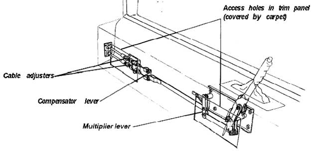 Towards the back, pull the carpet away and you'll see the cable adjusters. Loosen or tighten these to set up the handbrake. You should now have a working system. As you've removed the hoses, air will be in the hydraulic system, so you will need to bleed the brakes. Once this is done you can clean the new set-up with some brake cleaner and clean the hub and wheel nuts. Double check all the connections and check for leaks.