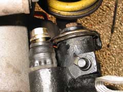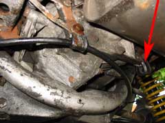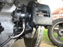 We now have something looking like a rear brake set-up. The caliper looks pretty small (same as on the rear of the Sport 350), but is holding some large pads that cover almost every cm of the disc. Now for the messy bit, attaching the brake hoses.