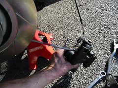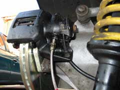 Time to remove the old brakes. We removed the pads and caliper as one. Two 19mm bolts hold the calipers on. This might be stiff after years on the Esprit. Some WD40 might help, but remember not to get any on the brake discs or pads.