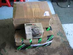 The Esprit brake upgrade shown here uses a kit supplied by PNM Engineering. The kit contains 2x 304mm Ventilated Brake Discs (grooved), 2x Brembo 1 pot Calipers, 2 x braided brake hoses, 2x alloy caliper mounting brackets, assorted nuts, washers & bolts. Brake pads are not included in the kit, so you can choose your own. They are the same as the V8 and Elise, so there's plenty of choice. We went for brake pads manufactured by Hawk as they should perform well with the grooved discs and match the pads we are running on the front of our Esprit.