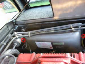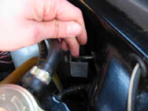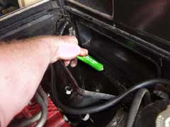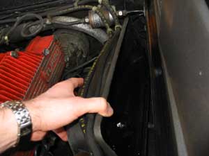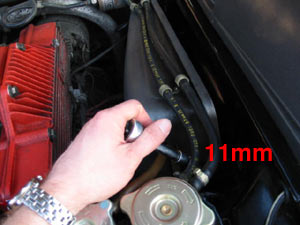 The Air filter is located on the right-hand side of the engine ( when looking from the rear of the car) and is underneath the trim that was removed for the Ram-Air conversion. The Air filter box is secured by two clamps, held by 11mm bolts. You'll see all sorts of pipes attached to the box (see above left). These do not need to be disconnected to get at the Air filter.