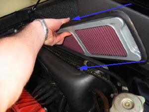 Follow the steps above for removing the old filter. Remove the original air filter. The original air filter has a rubber seal fitted to its metal frame. This just pulls off. This was when the fun started. Fitting the old rubber seal to the edge of the K&N filter is not easy. Id be so bold as to say impossible but Im sure someone will manage it . I thought that if only Ian Rawlings was here, hed have enjoyed the challenge. The flexible plastic frame is so wibbly wobbly that the seal keeps coming off. Eventually I tried using Dunlop 1358 carpet adhesive to stick it on. This glue, which sticks to anything, would not adhere to the plastic. I tried gaffer tape, masking tape, trim fix tape, gaffer clamps ( I used to be in the film biz) but nothing would hold it in place. I tried fitting it within the air box nothing worked.
