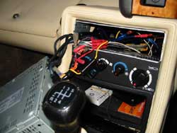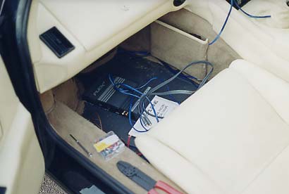 Remove the stereo and feed the RCA Leads down to the footwell. I used leads that include a power switch cable in between the Left & Right RCA Leads, this save feeding another cable through. The power switch cable turns the amp on when the ignition is turned on, this can be connect to a dedicated lead from the Stereo or to the Electric Aerial power-on lead. Speaker wire will also need to be fed from the amp to the stereo and connected to the speaker wires, or directly to the speakers (remember to connect the speaker wire to the wires connected to the speakers and not the the stereo).