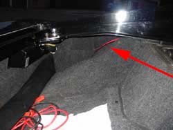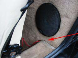 You may need to peel back the carpet to feed the wires through, which can be tricky not to rip the cloth. Both cable should come out near the rear speaker, you can then feed them under the passenger seat.