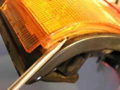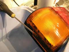 3: After a few minutes in the hot water you can start prying the amber lens of from the light cluster, use a flat screwdriver and be careful so you dont damage the cluster. If the lense doesn't want to come off, you might need to put the cluster back in to the hot water. Don't use too much force, that will only break the amber lens, since the amber plastic is quite fragile.