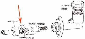 I decided to follow in your footsteps, by using the push-rod from the old master cylinder. I gave it a good clean before attaching it. However, I found there was no need to remove the push-rod from the pedal, I simply removed the circlip on the old master cylinder and then attached the push-rod to the new cylinder. This was all done under the bonnet from within the front bay. Okay, it took 2 or 3 attempts to get the circlip in place on the new cylinder, there is not much space, but all in all it still only took 10 minutes - just be careful not to let the circlip shoot off or you might never find it again. What about the rubber cover I hear you say? Well, obviously you need to replace this on the push-rod before you attach the new cylinder. The old rubber cover was split anyway, so that was easy to come off. With a little grease and a screwdriver to hold the rubber hole open, it wasn't difficult to get the new rubber over the end of the push-rod and the retaining washer, and no I didn't split it.