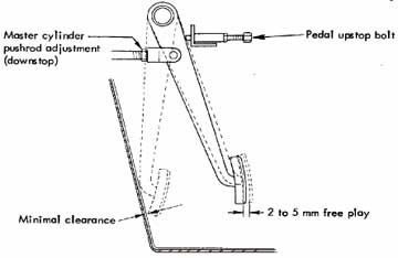 With the clutch pedal released, adjust the pedal upstop (if fitted), or discard if necessary to achieve 2-5mm upward free play on the pedal, ie the master cylinder is 'topping out'. If the master cylinder piston is restricted from reaching its full travel in either direction, clutch drag and/or slip will occur. You should now have a fully working, and new, clutch system.