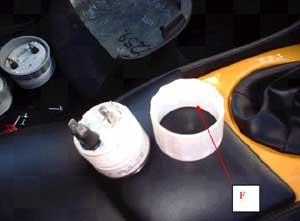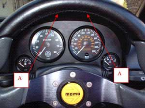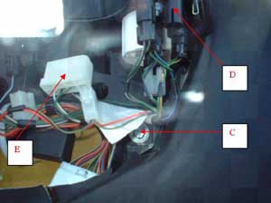 Remove two 10mm bolts marked C. After doing this remove connections to dials only and the associated illumination bulbs from their holders. Do NOT remove warning light bulbs marked D and E. If you do this will only add to the time on this install and you have to mark out where all the bulbs go to. If you place the bulbs in the wrong holes you will end up with incorrect warnings being illuminated on the mask. To remove the dials from the mask unscrew the collar marked F (pic 4). You now have enough room to lift out the dash and able to work on. Lay the new brushed stainless steel mask over the dash and install in reverse order. Tip, the plastic collars need to be positioned at the rear of the dash first before refitting each dial as there isn’t enough room for the dials to be fixed first then collars screw after.