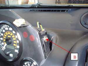 Remove two 5mm Allen bolts marked A. (pic1), Lift and slide off top of binnacle towards rear of car. Remove two cross head screws at either side marked B. (pic2)
