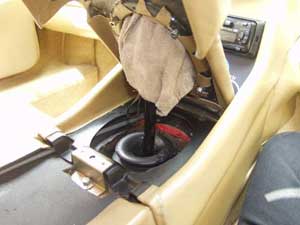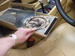 Left: Tilt the panel up at an angle and you will see that the front edge is held in place by a length of Velcro (very High Tech in the 1980s). You will also see that the leather gaiter is tightened by a piece of knicker elastic which should be tied in a pretty bow. Untie this and ease the gaiter over the head of the gearknob. Separate the Velcro on the front edge and carefully lift the panel away from the mounting area again, watch that leather!