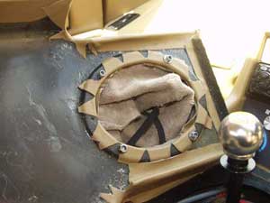 Right: Here you can see that the gaiter is clamped to the centre console by 4 nyloc nuts and washers. Above the console, there is a thin metal ring with 4 studs in it. The leather gaiter is stretched over the ring, the studs pass through 4 holes in the gaiter and then through the centre console panel itself.