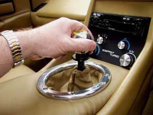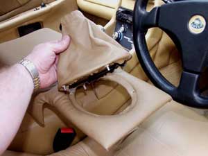 Left: The gaiter has now been removed from the console. Right: Take hold of your newly acquired polished alloy gearshift surround. Pause to admire its lustrous beauty.