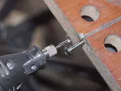 Left: Below the console, fit the washers and nuts to the screws and tighten with a socket or spanner until you have a flush fitting alloy surround. Centre: You may wish to only fit 2 screws in the North & South positions, then cut the remaining screws short with a junior hacksaw and fix the dummy heads in position with silicone sealant. Right: Alternatively you could cut the screws short with a Dremel type mini drill fitted with a cutting disc.