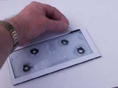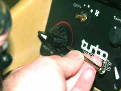 Remove the release paper from the self adhesive material on the reverse of the new heater panel. Carefully slide the panel into position over the knob shafts and press down firmly. The modern day self adhesive material means there is no need for the 2 small panel face screws. The material provides a good light tight seal around the edges of the panel.