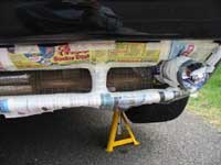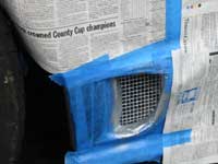 Masking up the rear isn't difficult, just a little time consuming. Using masking tape, we taped up right to the mesh covering the paintwork. Stuffed some newspaper into and around the exhaust pipe and then secured it with more tape. You can see (just) the rust colour of the mesh before we started. Tape up the whole job and check that no paintwork is showing.