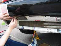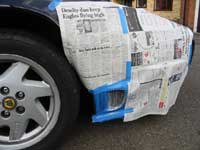 You can now start adding newspaper to protect the surrounding areas. This is taped to the paintwork. We started with the immediate area and carefully covered it. Then just to make sure we used larger pieces to cover the whole bumper. Leaving no areas uncovered for any over-spray.