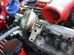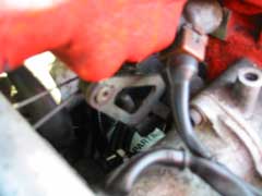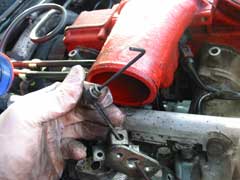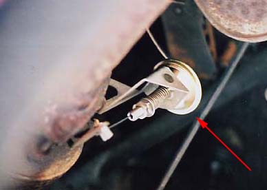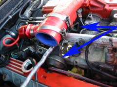 Once the chargecoolers been moved out of the way, you'll see the capsule and where the rod attaches to the throttle cable. The blue arrows point out the capsule and connection.