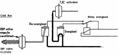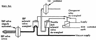 The vacuum pump feed to both the back pressure valve and throttle jacking capsule is controlled by two vacuum solenoid valves located in the engine bay relay box. When each valve is energised a vacuum feed is supplied to that component. The two solenoid valves are controlled by the ECM via a changeover rely, such that when the back pressure valve solenoid is energised (vacuum supplied, EBP valve opened) the throttle jacking solenoid is de-energised (no vacuum supplied, no throttle jacking) and vice versa.
