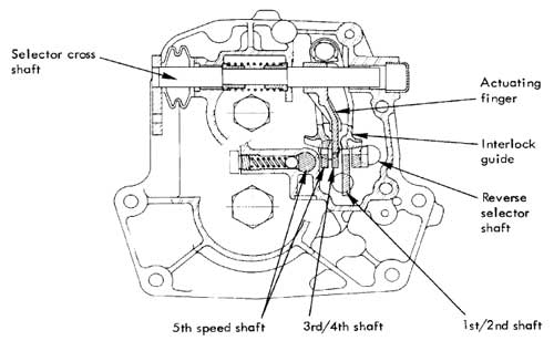 Four selector shafts lie along the right hand side of the gearbox, and are operated by a cross shaft with a single actuating finger. A slotted interlock guide prevents more than one selector shaft being moved from the neutral position at any one time.