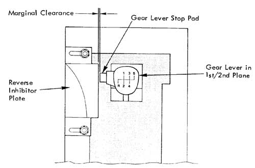 The gearchange lever assembly incorporates a reverse inhibitor which necessitates a collar beneath the lever knob to be raised before the lever may be moved fully to the left, and then rearwards, to select reverse gear. Raising of the collar causes a stop pad to be lifted above an inhibitor plate allowing the lever to be moved fully leftwards. The reverse inhibitor is correctly set if the first and second gears may be obtained without obstruction, but reverse gear cannot be selected without first lifting the gear lever collar.Before any adjustment to the inhibitor plate position is made, first check that the gearchange cables are correctly adjusted. (see above).