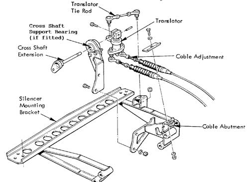 A two cable mechanism is used to connect the gearchange lever to the gearbox cross-shaft. The gearchange lever assembly is arranged to provide a pull or push equally to both cables when moved in the fore/aft plane. When the lever is moved side to side (crossgate), the mechanism provides a pull to one cable and a push to the other. At the gearbox end this cable movement is converted via a 'translator' into rotational or axial movement of the gearbox cross shaft.