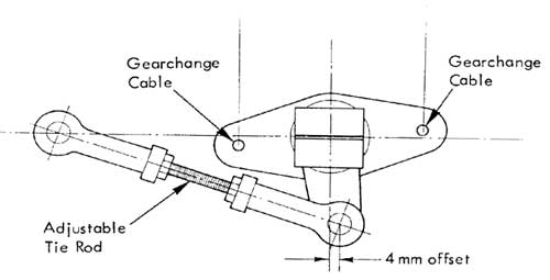 When the two gearchange cables pull or push together, the lower end of the translator is pulled or pushed, and a rotation imparted to the cross shaft. When one cable pulls and the other pushes, the translator is rotated about its vertical axis, but since the top arm of the translator is connected by a tie rod to a fixed bracket, the translator itself must pivot around the outer end of its top arm, thus imparting an axial (lateral) movement to the cross shaft.