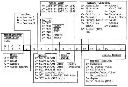 501 = Basic Elite 521 = Basic Eclat 701 = Basic Esprit 502 = Elite A/C 522 = Eclat A/C 702 = Esprit A/C 503 = Elite A/C & PAS 523 = Eclat A/C & PAS 701 Comm = Esprit Commnerative 504 = Elite Auto A/C& PAS 524 = Eclat Auto A/C & PAS 702 C m = Esprit C m . A/C 2. Seperate serial number sequences are used for the follwing groups of chassis mrket (character 12);