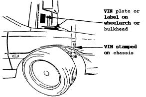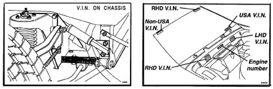 The Vehicle Identification Number (VIN) is stamped on a plate fixed to the right or left har.d front wheelarch inside the front luggage compartment. This number is repeated on the right hand side of the chassis front frame, visible from within the right hand front wheelarch.