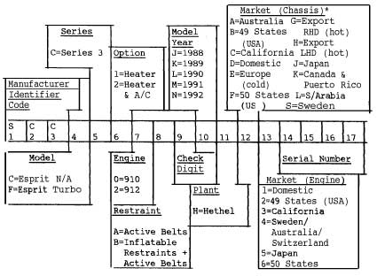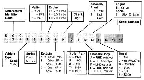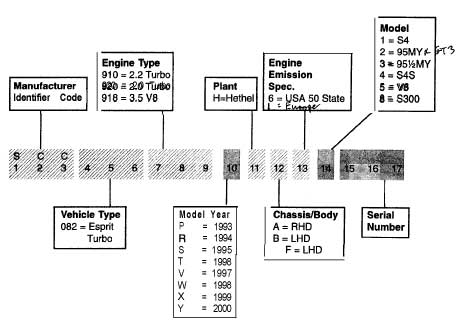 (Vehicle Indentification Number) Where is it and what does it mean?We had a few questions about VIN numbers in the past, so thought it's about time we sorted out a short guide for Esprit owners to clear up all the information about VIN numbers on the different Esprit engines. This information is taken from the service manuals of each model. Unfortunately the early manual weren't as informative as the later ones. So here we go.