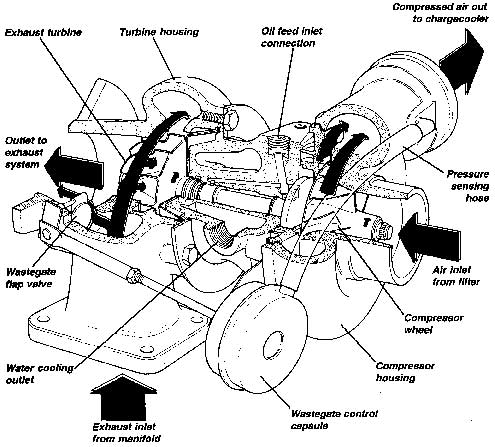 and reduces the possibility of carbonisation of the oil in the turbocharger.The turbocharger unit is, with the exception of the wastegate capsule, a non-serviceable item which must be renewed if faulty. A certain amount of free play in the shaft bearings is a design feature, and should cause no conuem unless the amount of play allows the turbine or compressor wheels to contact any part of their housings. The shaft should turn freely and smoothly and the turbine and compressor blades should be free form signs of mechanical damage. Note that great care must be taken when working on the engine to prevent any foreign bodies from entering the turbocharger or the wheels will be severly damaged.
