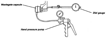 Problems with turbo boost pressure may be mechanically or electronically derived. The base mechanical setting of the wastegate capsule should allow 0.35 bar (5.0 lb/i@ to be developed. If this cannot be achieved, the cause may be general engine condition and tuning, a broken wastegate capsule spring, seized or stiff wastgate linkage, or a leaking or burnt wastegate valve seat. Check cylinder compressions, valve timing and other basic tuning parameters, and for the free, spring loaded, operation of the wastegate. Inspection of the wastegate seat condition is possible after removal of the exhaust pipe from the turbocharger.The wastegate capsule and actuating rod are calibrated by the turbocharger manufacturer and can be checked using a dial gauge and hand operated pressure pump with 0 - 1 bar (15 lb/inn) pressure gauge: