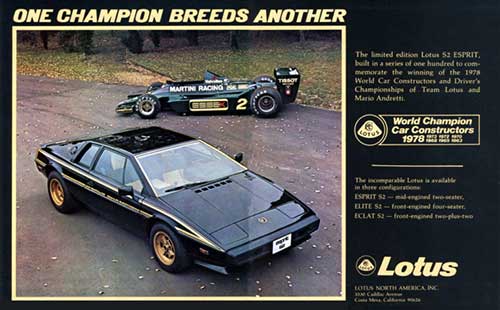 1978 saw Lotus win the International Cup for F1 Constructors and in celebration of this they introduced a special limited edition of their Series 2 Esprit which was painted in a black and gold livery to match the colors of Lotus Formula 1 sponsors at that time, tobacco company John Player & Sons.