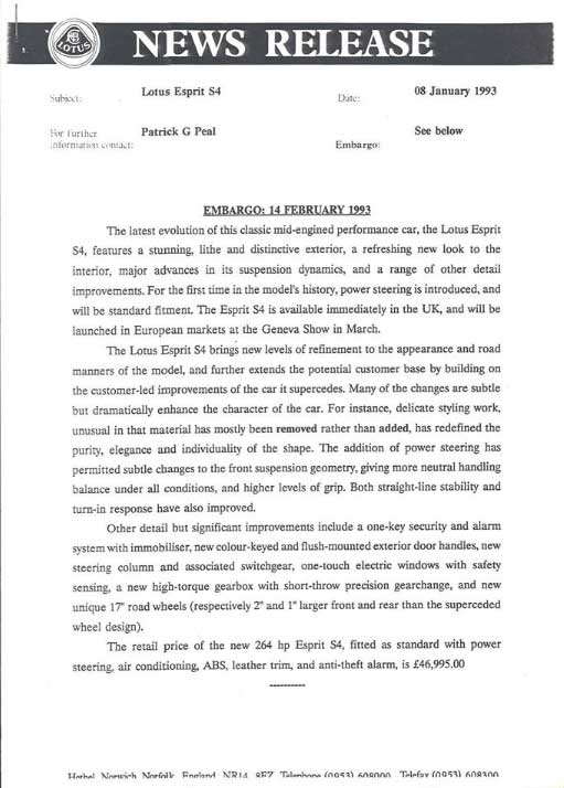 In 1993 Lotus introduced their latest evolution of this classic mid-engined performance car, the Lotus Esprit S4. Featuring a stunning, lithe and distinctive exterior, a refreshing new look to the interior, major advances in its suspension dynamics, and a range of other detail improvements, the S4 maintains world-leading standards of handling, performance and style for which Lotus has become famous over the last 40 years.