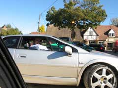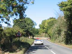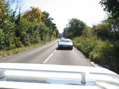 We stopped in a large lay-by to gather everyone up and recover from the shock of coming over a brow of a piece of dual carriageway and seeing a policeman pointing a laser gun at everyone. Luckily we turned around at the roundabout just a few hundred yards ahead, so any awaiting police couldn't stop us. Our first stop to gather everyone up was opposite the police car. So everyone climbed down the ditch and poked their heads over the fence to check him out.
