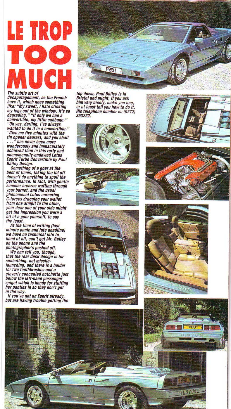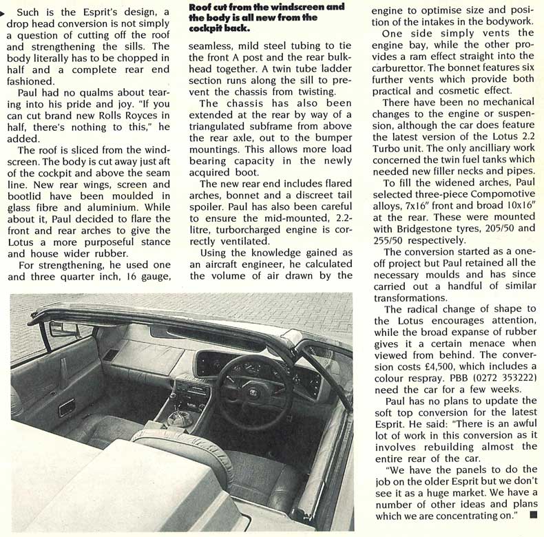 Both kits resurrected many esprits that would otherwise have been scrapped. As i said, the convertable kits main component was the one piece rear upper body section which was used to replace the entire original bodywork from the firewall back and from the waist line up.Strengthening was added to the sill from door pillar to the area beneath the fuel tank, then covered by turbo style sills. Windscreen surround was also re-enforced as was the area rear of the chassis to the tail.the result was very strong with virtually no scuttle shake. The roof had foldable pillars and was designed so it could be stowed easily in the rear of the engine compartment. It was in great condition for a collectible car, no injuries in it and it was not involved in any car accidents.