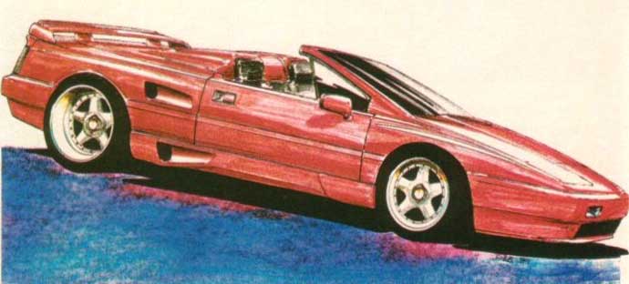 Starting with a Lotus Esprit Turbo, Kollinger have completely redesigned the section to the rear of the cockpit. In place of the fastback roofline and rear window there is now an asymmetric engine cover with individual head fairings and a large air intake on the righ hand side, plus a removeable centre section to give acces to the 210bhp four cylinder engine. In addition to the rear lip spoiler there's also a slight lip along the trailing edge of the windscreen surround in order to deflect the wind over the cockpit. It'll presumably do the same to raindrops when one is travelling at speed, though quite what you're meant to do when the car is stationary one can only speculate, since like Bertone's Athon show car of 1980 there's no provision for a hood.