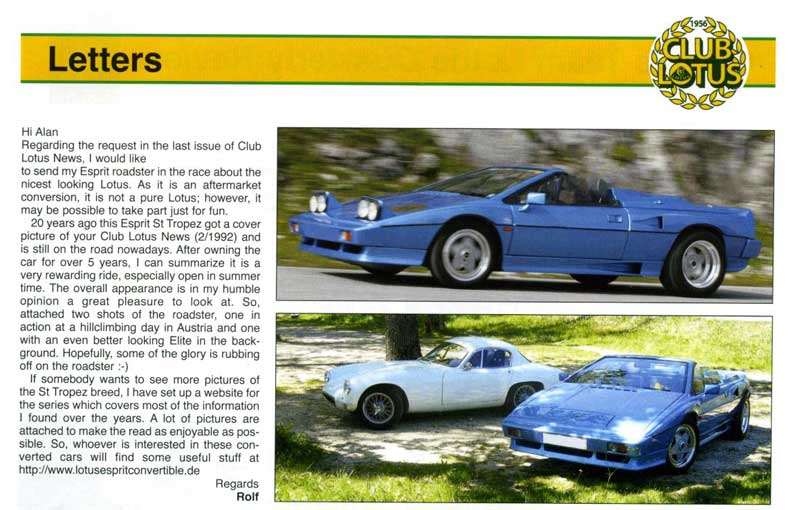 To your photos, the yellow car was my personal vehicle for quite a while and was featured in the Club lotus magazine and Top car magazine which these photos come from,they were taken at Southend airport. It had the Rover V8 installed, I sold it in about 1996 to a German who took it back to Germany. The red car may also have been one of mine (but with a private Plate} The white car was Paul bailey's first conversion and the blue one his second. Due to the passage of time etc, i no longer have any drawings or photos, but however, I do still have all the moulds and jigs for the st tropez and V8 conversion in storage.